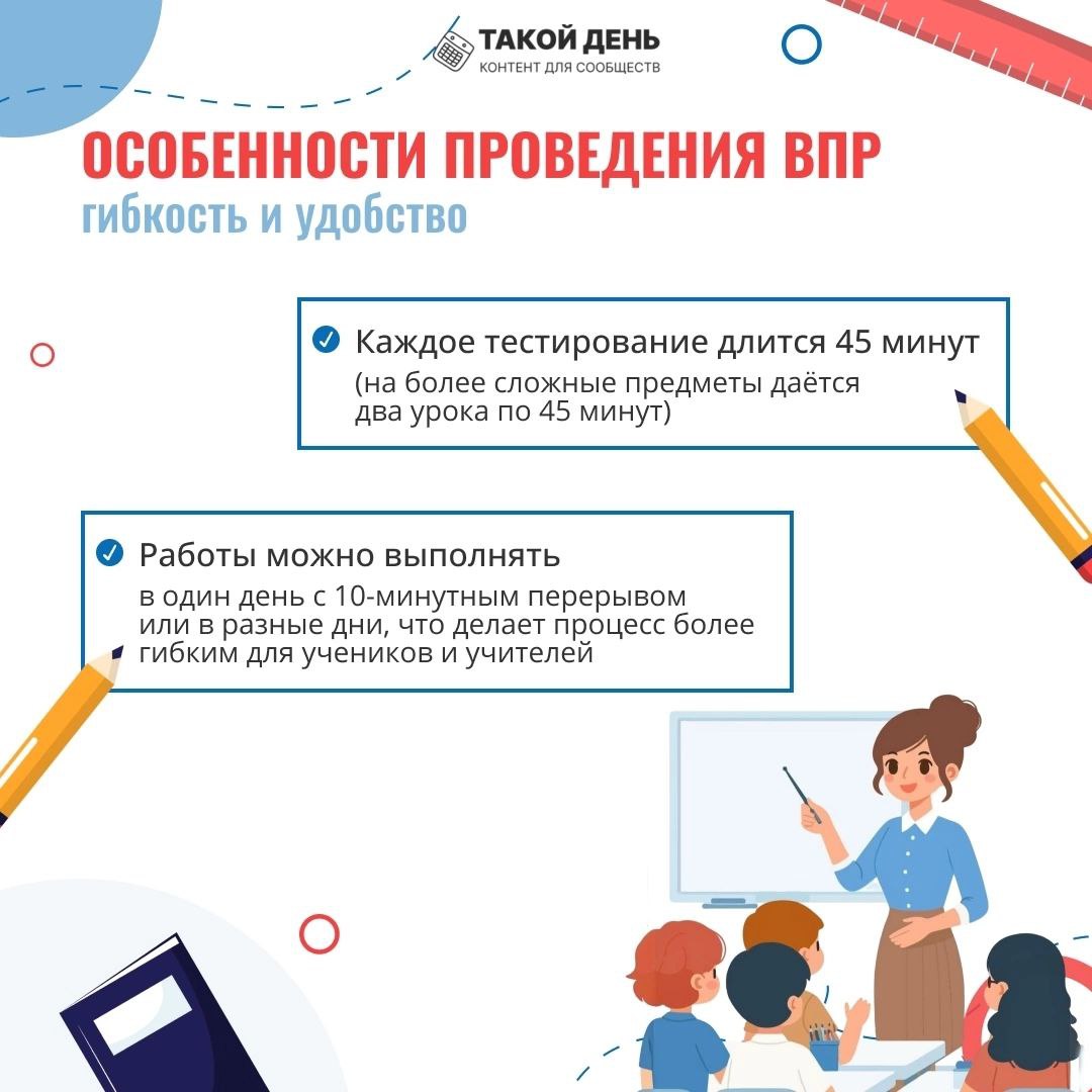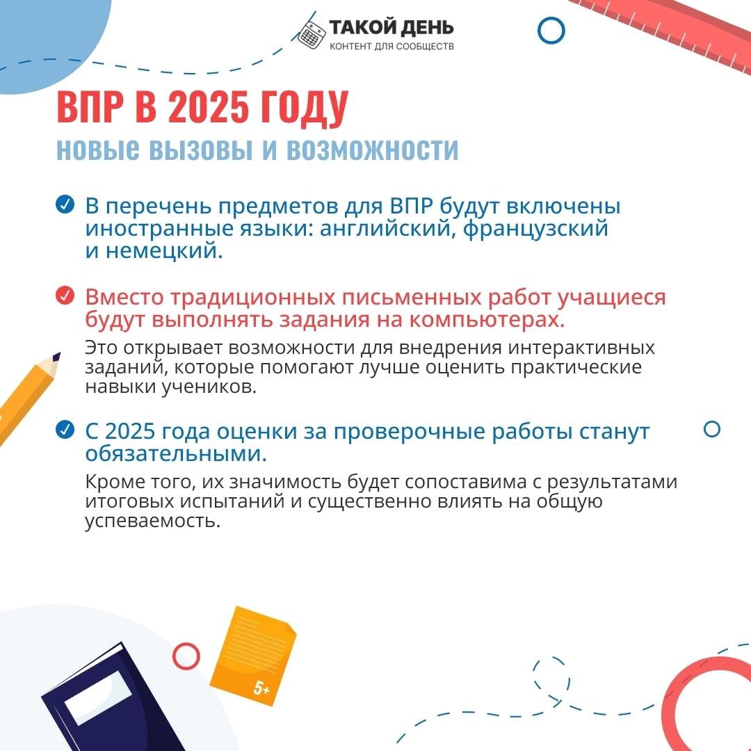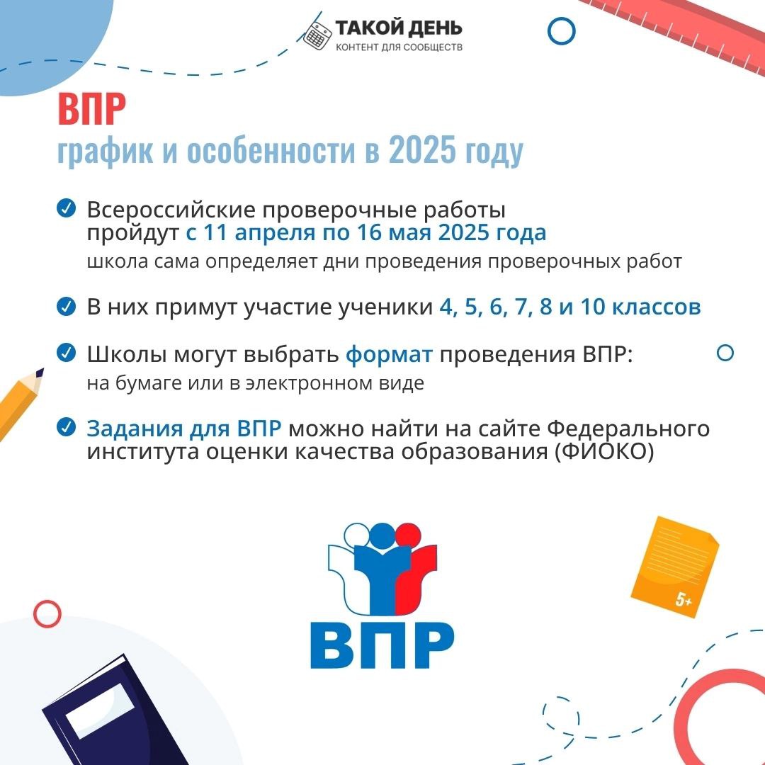 Утвердили график ВПР-2025 Рособрнадзор опубликовал расписание ВПР на 2024/25 учебный год (приказ Рособрнадзора от 13.05.2023 № 1008). Приказом определили сроки ВПР, скорректировали процедуру проведения и изменили состав участников. В расписании ВПР-2025 изменили состав участников по сравнению с прошлым годом. Одиннадцатиклассники не будут писать проверочные работы даже в режиме апробации. Разработчики исключили 11-е классы из расписания. В расписание добавили 10-е классы. Они в штатном режиме пройдут ВПР по четырем предметам с 11 апреля по 16 мая. Работы по русскому языку и математике напишут все десятиклассники. Еще два предмета случайным образом выберет Рособрнадзор из списка: география, физика, химия, литература, история, обществознание, иностранный язык (английский, немецкий, французский). Еще одно из нововведений – для каждого предмета разработчики указали, сколько времени нужно выделить, чтобы школьники выполнили проверочную работу. Например, на работу по математике в 5-м классе понадобятся два урока по 45 минут каждый. Также в расписание ВПР включили оговорку для учеников 8-х и 10-х классов, которые участвуют в национальных или международных исследованиях качества образования. Такие дети не участвуют в ВПР-2025. Разработчики исключили выборочное проведение ВПР с контролем объективности результатов. Еще скорректировали количество и состав предметов. Например, в 4-х классах добавили литературное чтение и иностранный язык, но при этом дети напишут работы по трем, а не четырем предметам, как было в прошлом году. Смотрите расписание ВПР-2025